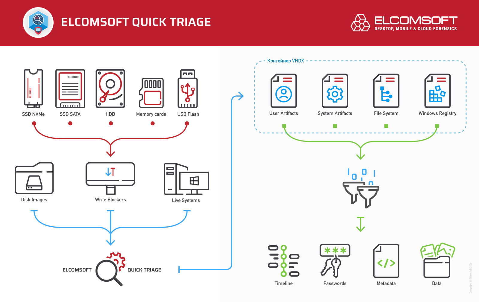 Elcomsoft Quick Triage is a tool designed to rapidly extract and analyze the most important evidence from a target computer or disk. It is equally effective during on-site operations and in laboratory environments, helping investigators make informed decisions at the earliest stages of an investigation.